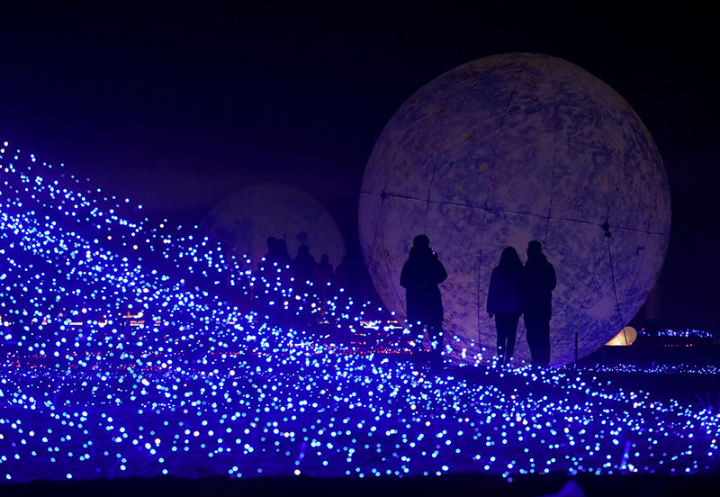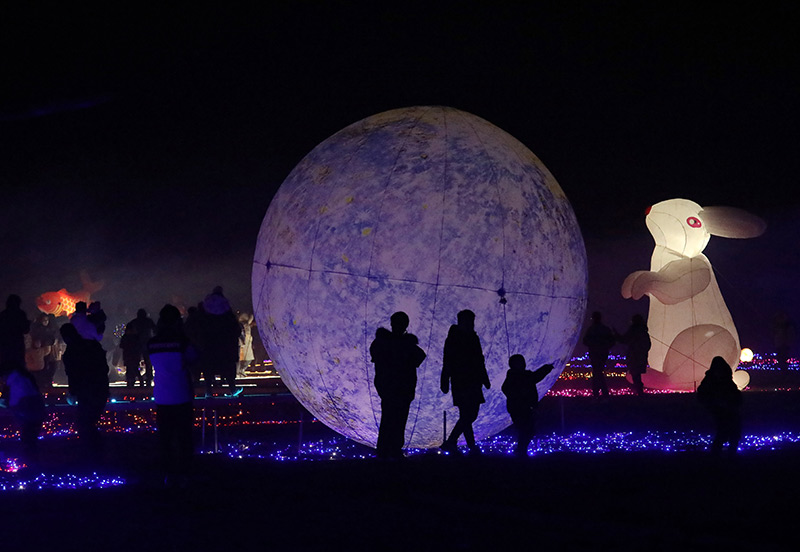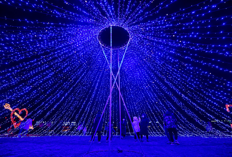 1月25日,游客在河北省石家庄晋州市周家庄乡第九生产队欣赏灯光秀。
