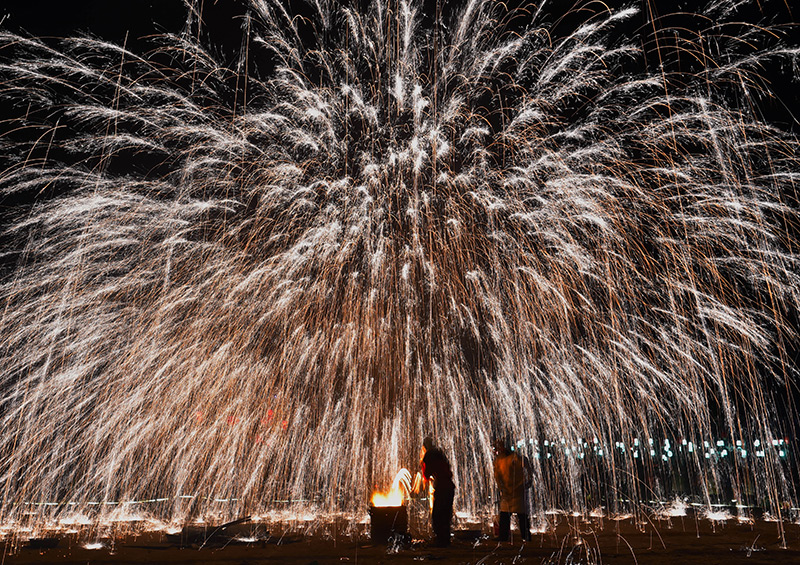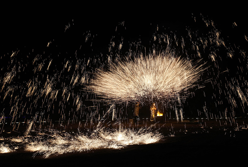 1月25日,民间艺人在河北省石家庄晋州市周家庄乡第九生产队为游客表演打铁花。