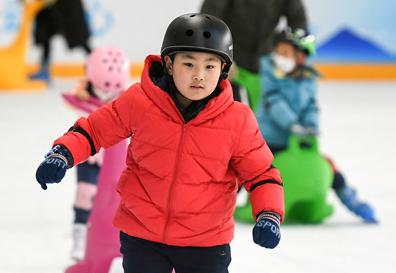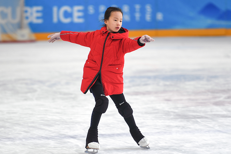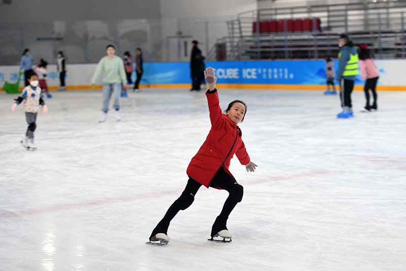 1月29日,一名小朋友在“冰立方”冰上运动中心滑冰。