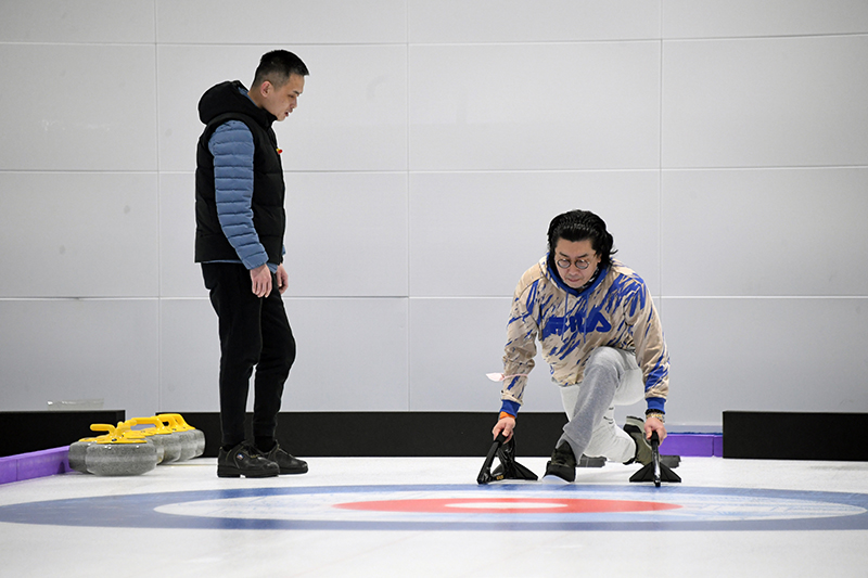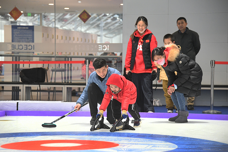 1月29日,游客(右)在“冰立方”冰上运动中心练习冰壶基础动作。