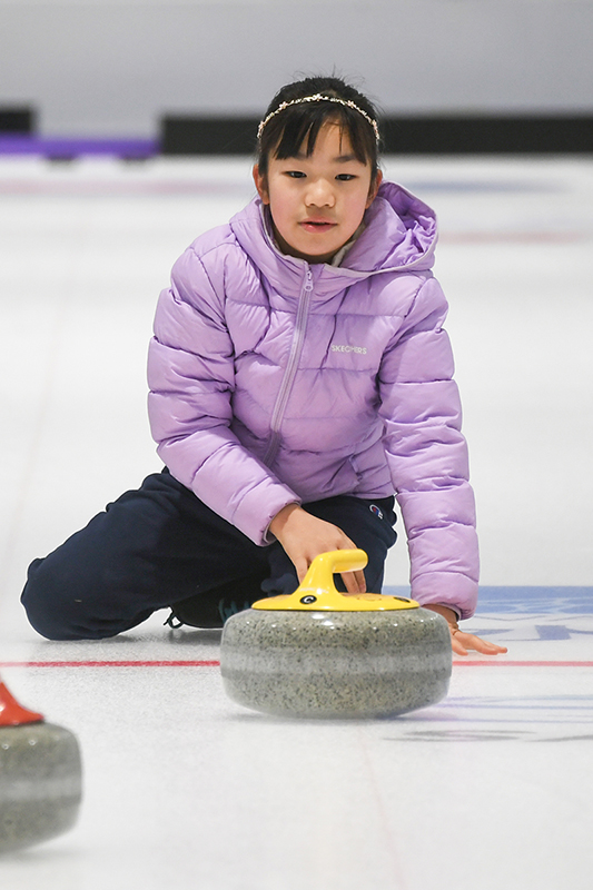 1月29日,一名参加冰壶专业培训班的小朋友在“冰立方”冰上运动中心练习投壶。