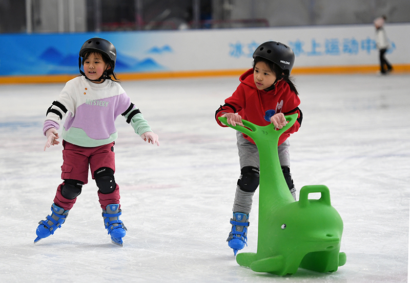 1月29日,小朋友们在“冰立方”冰上运动中心滑冰。
