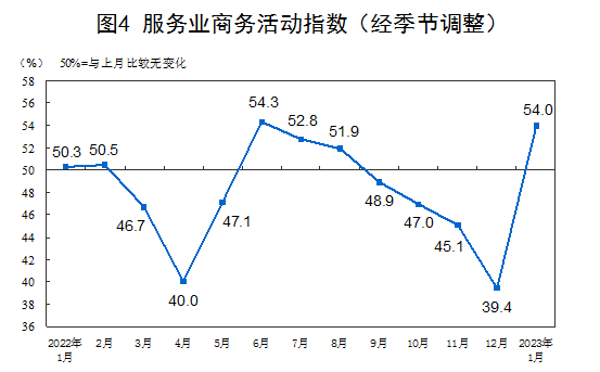 1月份,非制造业商务活动指数为54.4%,比上月上升12.8个百分点,高于临界点,非制造业景气水平触底回升。