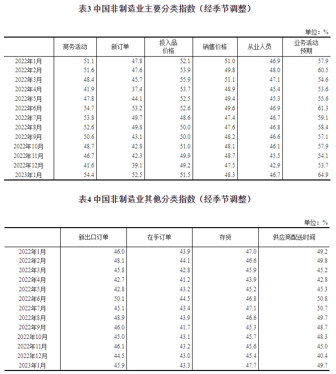 (1)分类指数的计算方法。制造业采购经理调查指标体系包括生产、新订单、新出口订单、在手订单、产成品库存、采购量、进口、主要原材料购进价格、出厂价格、原材料库存、从业人员、供应商配送时间、生产经营活动预期等13个分类指数。非制造业采购经理调查指标体系包括商务活动、新订单、新出口订单、在手订单、存货、投入品价格、销售价格、从业人员、供应商配送时间、业务活动预期等10个分类指数。分类指数采用扩散指数计算方法,即正向回答的企业个数百分比加上回答不变的百分比的一半。由于非制造业没有合成指数,国际上通常用商务活动指数反映非制造业经济发展的总体变化情况。
