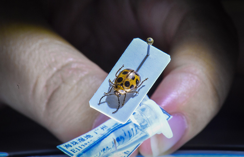 这是在广州海珠湿地发现的一个昆虫新物种——海珠斯萤叶甲的标本(2021年10月25日摄)。