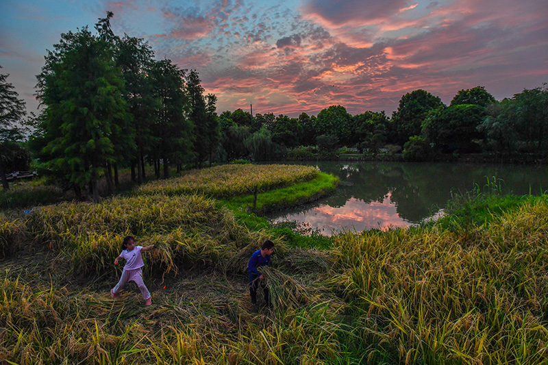 孩子在广州海珠湿地水稻田体验收割劳作(2020年7月25日摄)。