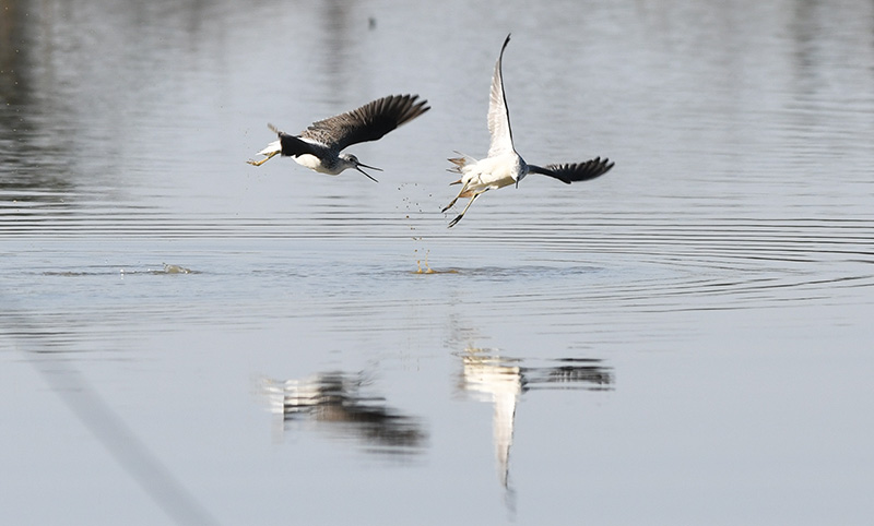 两只青脚鹬在海南东寨港国家级自然保护区内飞翔(1月30日摄)。
