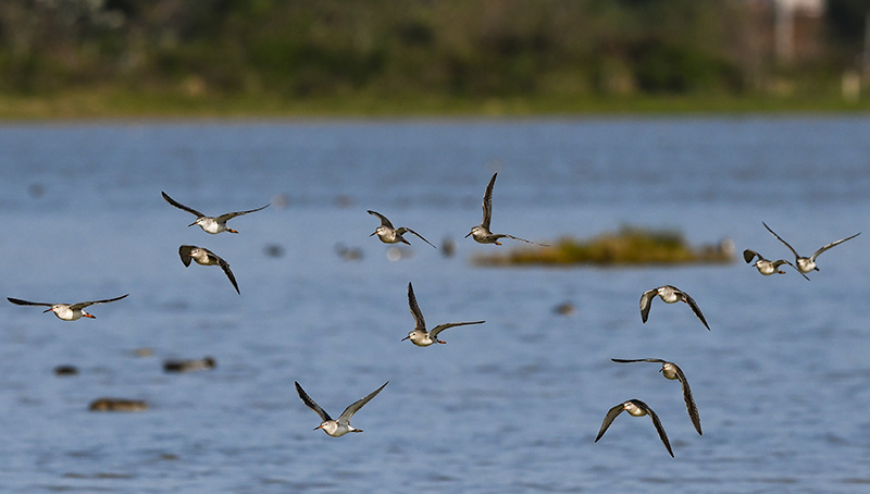 一群鹤鹬在海南东寨港国家级自然保护区内飞翔(1月30日摄)。