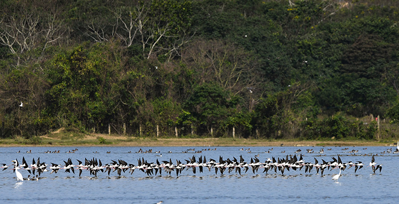 一群黑翅长脚鹬在海南东寨港国家级自然保护区内飞翔(1月30日摄)。