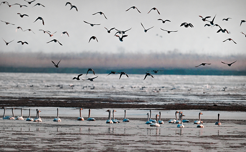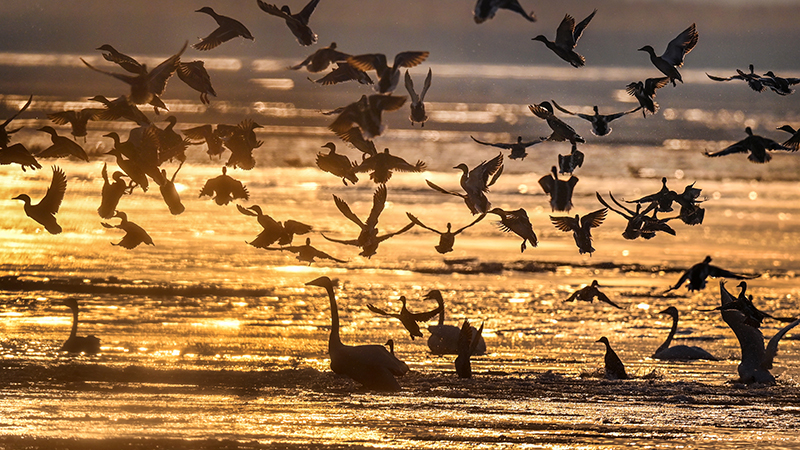 2月3日,黄河西岸的合阳黄河湿地自然保护区内,群鸟翔集嬉戏。