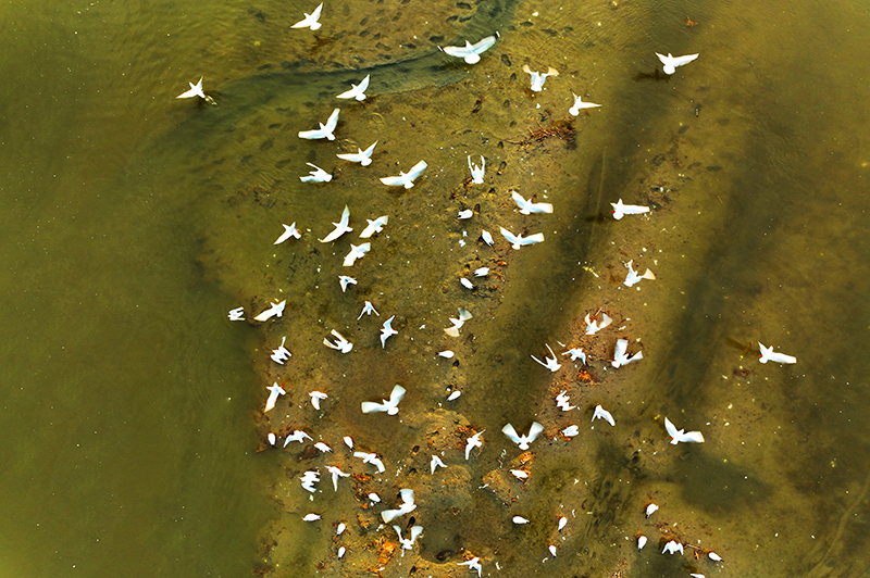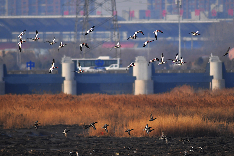近日,在山东省青岛市城阳区流亭街道墨水河入海口湿地,各种水鸟或赶潮觅食或翩跹飞翔,绘就一幅美丽的生态画卷。