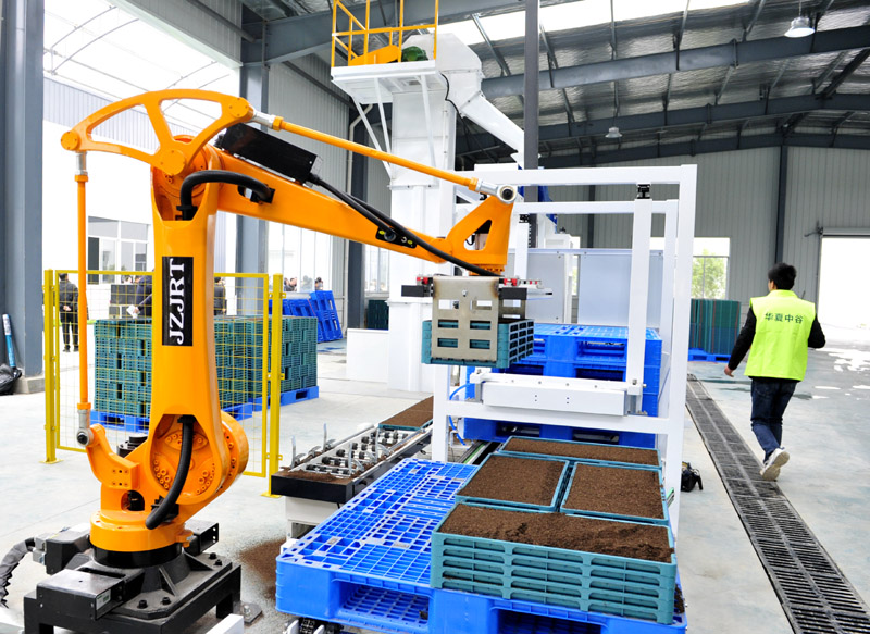 2月24日,在泾口乡工厂化智能育秧中心,自动化装备将种子秧土按照比例均匀铺到秧盘上。