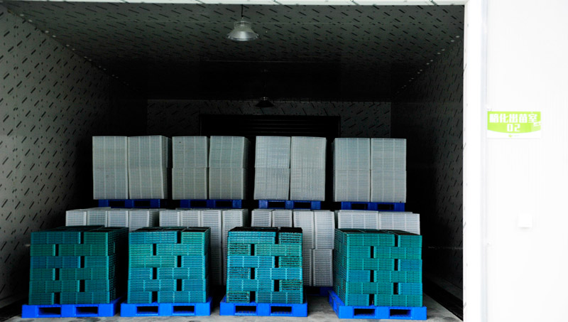 2月24日,在泾口乡工厂化智能育秧中心,大批育秧秧盘已转运至出苗室内进行育秧。