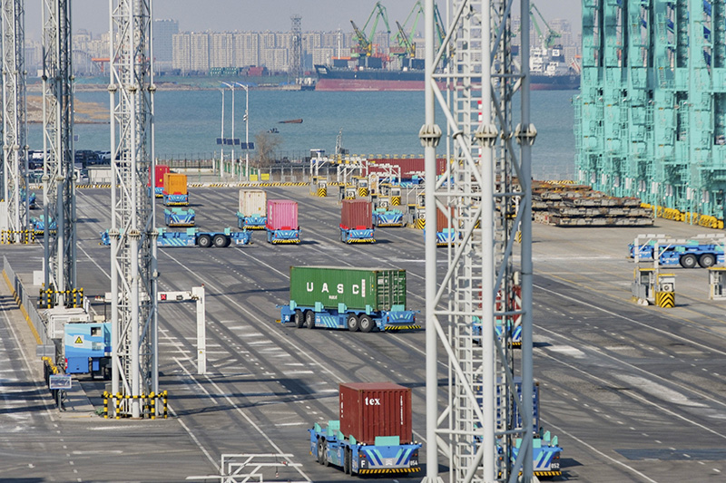智能水平运输机器人在天津港全物联网集装箱码头作业(2月21日摄)。新华社记者 张铖 摄