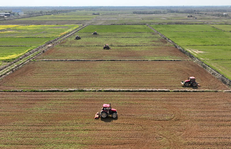 在江西省南昌县大田农社,农民驾驶农机在稻田里耕作(3月15日摄,无人机照片)。