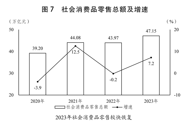 一是消费潜力进一步释放。出台实施恢复和扩大消费的20条政策措施。稳定和扩大汽车、家居、电子产品等重点消费,延续和优化新能源汽车车辆购置税减免政策,加快推进充电基础设施建设,全国充电基础设施累计达859.6万台。加强消费者权益保护,持续优化消费环境。推动文化、旅游、餐饮等生活服务消费加快恢复,全年服务零售额增长20.0%,国内出游人次、居民出游花费分别增长93.3%和140.3%。全年社会消费品零售总额达到47.15万亿元,增长7.2%,其中,网上零售额达到15.43万亿元,增长11.0%。成功举办中国品牌日活动。开展“消费提振年”活动。加快国际消费中心城市培育建设。