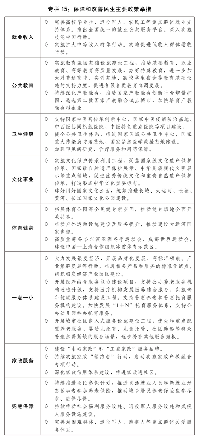 四是促进社会事业繁荣发展。推动义务教育优质均衡发展和城乡一体化,改善农村寄宿制学校办学条件,提高职业教育质量,建设中国特色、世界一流的大学和优势学科,实施高等教育综合改革试点,研究优质高等教育资源扩容、优化学科专业和区域布局,增强中西部和东北地区高校办学实力。推进教育高水平对外开放。加强精神文明建设,大力发展社会主义先进文化,推动中华优秀传统文化创造性转化、创新性发展。加强文化遗产保护传承利用,推动文化事业和文化产业繁荣发展。加强文化遗产普查认定,开展第四次全国文物普查,建设国家文化遗产资源大数据库。加强历史文化名城、街区、村镇等整体保护和活态传承。推进中华文明探源。保护传承弘扬好长江、黄河文化。建好用好国家文化公园。推动实施重大文化产业项目带动战略,进一步完善相关政策。创新实施文化惠民工程,加强重大公共文化和旅游设施建设,推动文化和旅游深度融合和高质量发展。发展哲学社会科学、新闻出版、广播影视、文学艺术和档案等事业。持续推进全民健身工作,推动体育公园和国家步道体系建设,打造户外运动高质量目的地,加强社会足球场建设利用,普及群众性公益性赛事活动。推动城市社区嵌入式服务设施建设工程落地生效,让群众在家门口享受到优质普惠社区服务。全面加强儿童友好城市建设。开展家政服务质量提升十大行动,深化家政服务产教融合。加强社会服务设施建设,强化对残疾人等重点群体的关爱与服务。