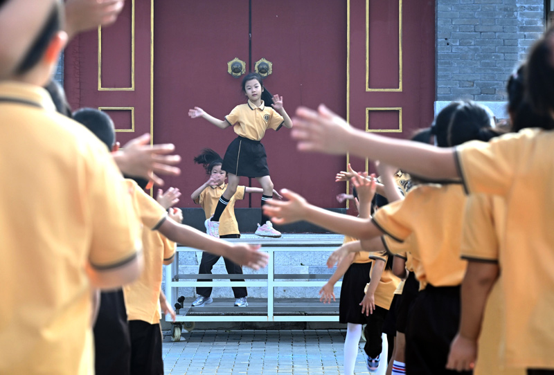 2024年9月2日,北京第二实验小学学生在教室外锻炼。新华社记者 金良快 摄