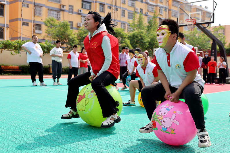 2024年5月17日,在山东省枣庄市市中区特殊教育中心,青年志愿者与智力障碍学生一起做游戏。新华社发(孙中喆 摄)