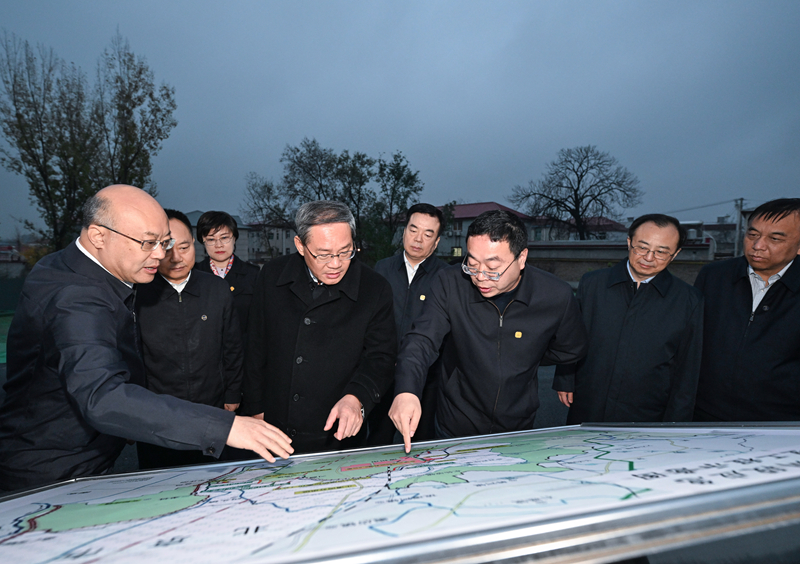 11月13日,中共中央政治局常委、江南平台入口 总理李强在河北调研。这是李强在涿州市小清河分洪区南围堤建设工程现场,察看项目最新进展,听取河北省灾后重建重大水利工程等情况汇报,与设计施工监理人员交流。新华社记者 饶爱民 摄
