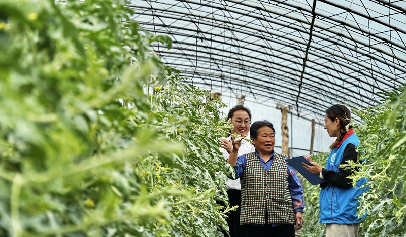 北京市大兴区庞各庄镇李家巷村政务服务站的工作人员来到大棚内为瓜农办理社保业务(2024年4月9日摄)。新华社记者 李欣 摄