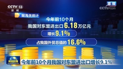 据海关统计,今年前10个月,我国对东盟进出口6.18万亿元,增长9.1%,占我国外贸总值的16.6%。