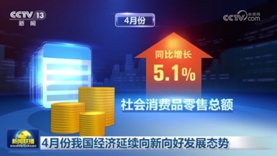 从消费来看,消费品以旧换新政策效应持续释放,市场销售保持稳定增长。4月份,社会消费品零售总额同比增长5.1%,其中,消费品以旧换新相关商品销售大幅增长,合计拉动社会消费品零售总额增长1.4个百分点。