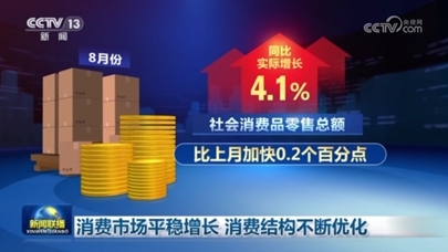 国家统计局数据显示,8月份,社会消费品零售总额同比实际增长4.1%,比上月加快0.2个百分点,消费市场保持平稳增长。
