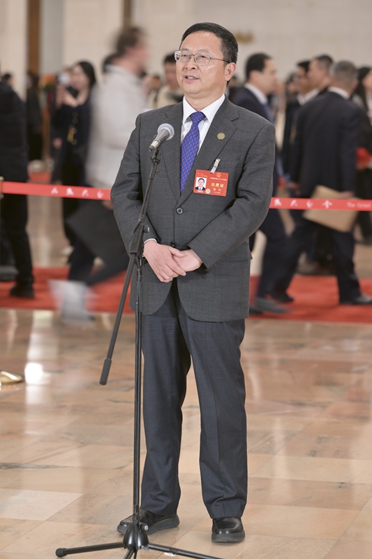 3月11日,第十四届全国人民代表大会第二次会议第三场“代表通道”集中采访活动在北京人民大会堂举行。这是全国人大代表王旭接受媒体采访。