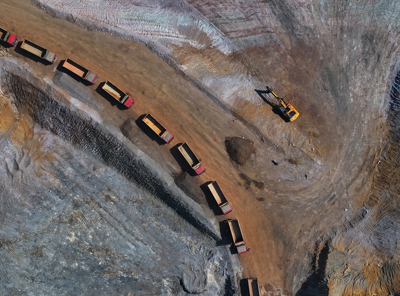 施工车辆在平陆运河马道枢纽建设现场排队(11月7日摄,无人机照片)。
