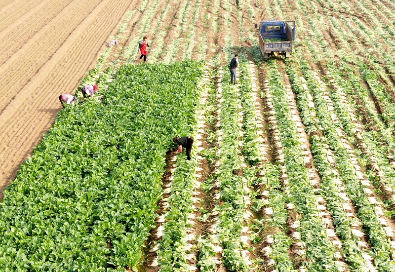 11月7日,在河北省唐山市丰润区七树庄镇小李庄村,菜农在田里收获白菜(无人机照片)。