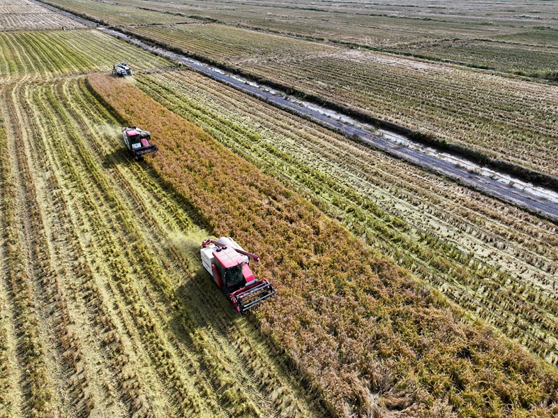 11月7日,在河北唐山芦台经济开发区四分场,农民在驾驶收割机收割水稻(无人机照片)。