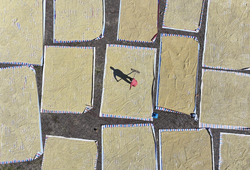 11月7日,湖南省永州市江永县兰溪瑶族乡的农民在晾晒稻谷(无人机照片)。