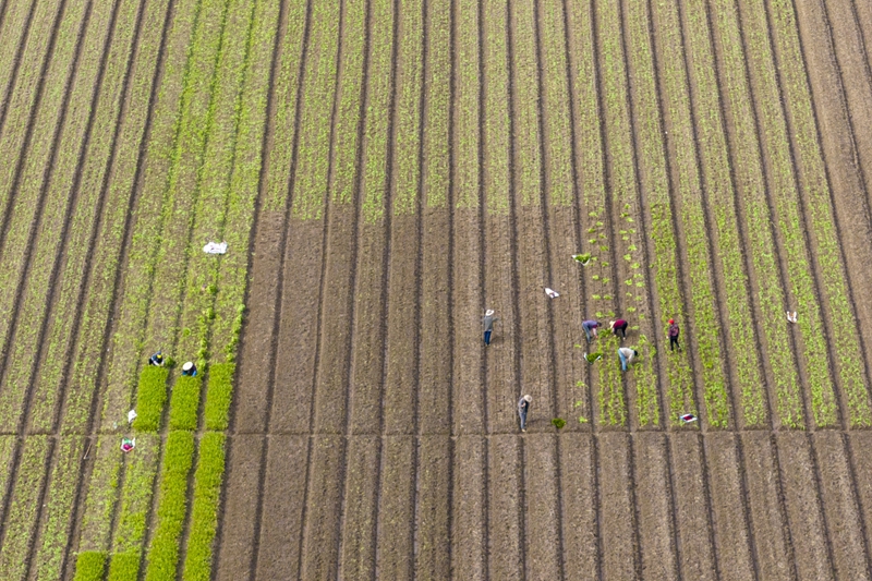 11月7日,湖北省十堰市张湾区花果街道蔡家村村民在菜地拔草(无人机照片)。