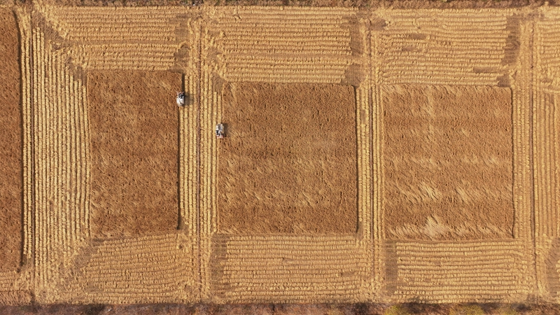 11月7日,农民在河北唐山芦台经济开发区四分场稻田里晾晒稻谷(无人机照片)。