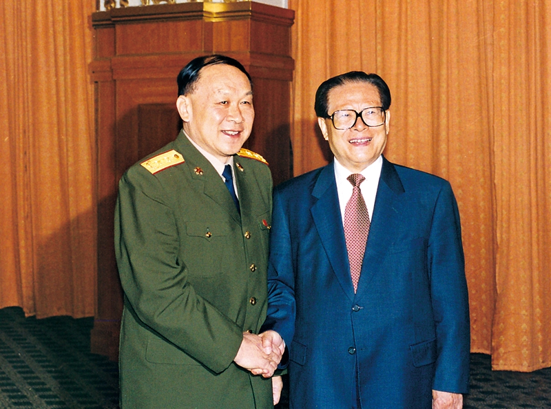 1999年8月,江泽民同志在辽宁考察时与梁光烈同志在一起。