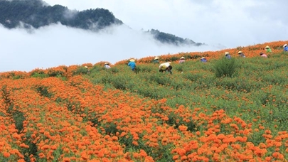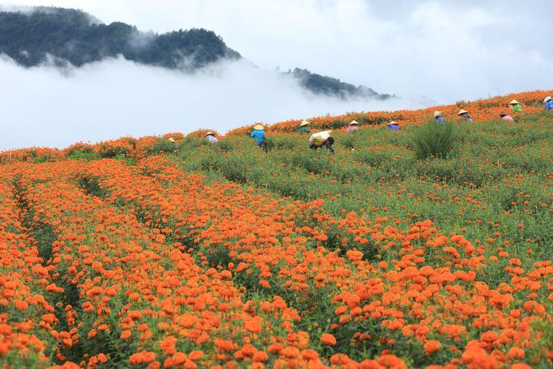 8月7日,在云南腾冲市固东镇,农民采收万寿菊。