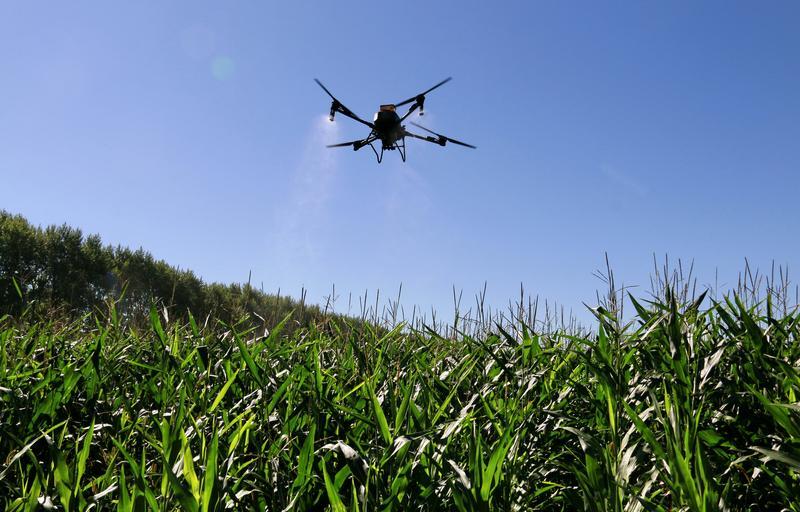 8月7日,在北大荒集团黑龙江格球山农场有限公司第二管理区,一架植保无人机为玉米喷施“营养液”。