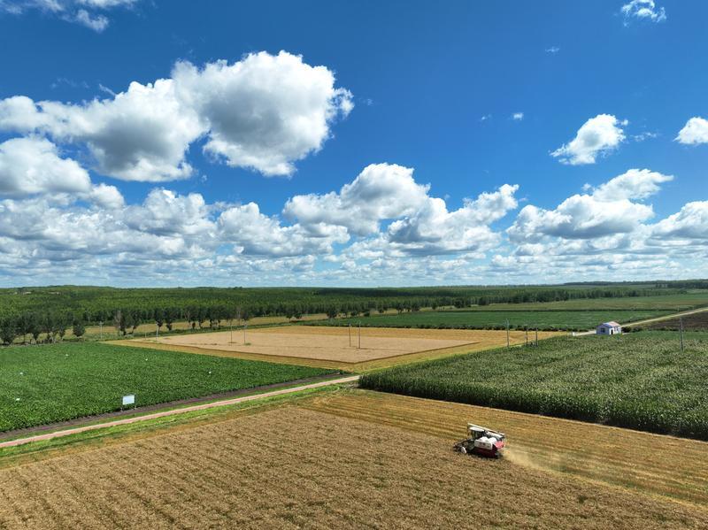 8月7日,在黑龙江省农垦科学院九三科创中心,一台收割机在小麦繁殖田进行收获作业(无人机照片)。