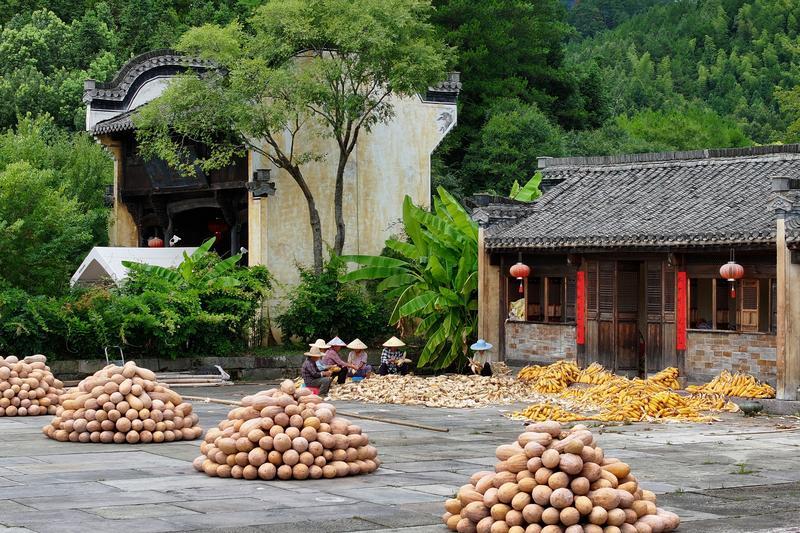 8月7日,在安徽省黄山市徽州区呈坎村,村民在晒场上晾晒农作物(无人机照片)。