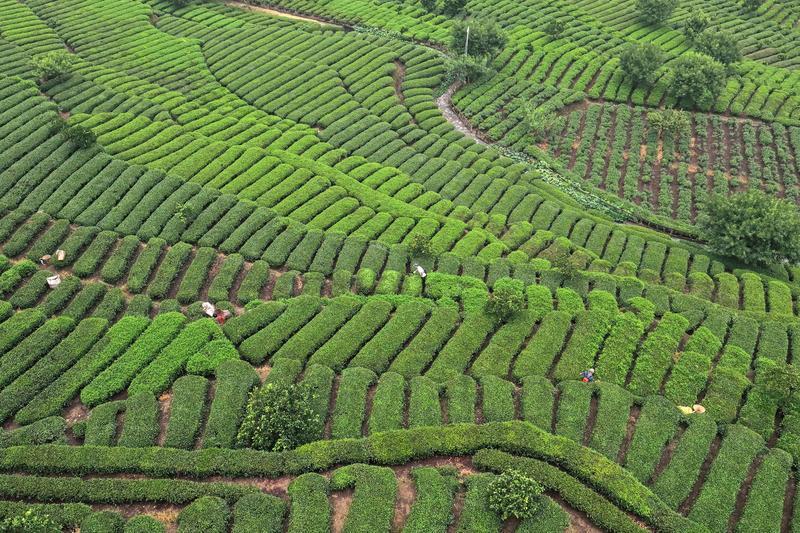 8月7日,茶农在三峡库区湖北省宜昌市秭归县茅坪镇松树坳村一茶园采摘秋茶(无人机照片)。