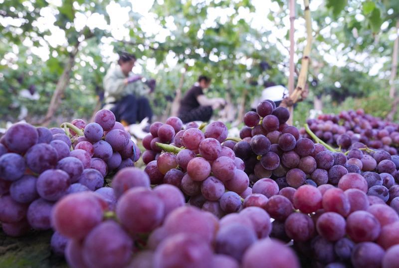 8月7日,在河北省石家庄晋州市桃园镇周头村葡萄种植基地,当地农户采收葡萄。