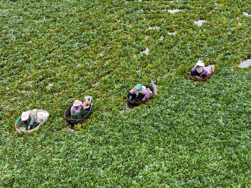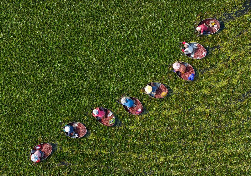 8月7日,在江苏省淮安市洪泽区岔河镇,村民划着菱桶在水面上采收菱角(无人机照片)。