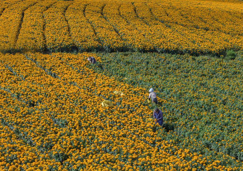 8月7日,云南省文山壮族苗族自治州丘北县腻脚彝族乡花农在采收万寿菊。