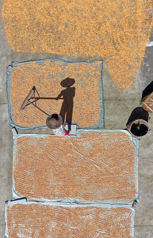 8月7日,在浙江省台州市仙居县皤滩乡,村民趁着晴好天气晾晒玉米(无人机照片)。