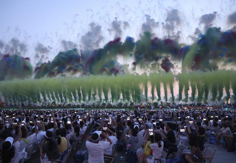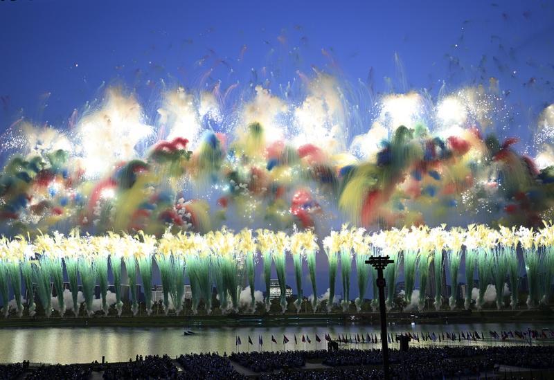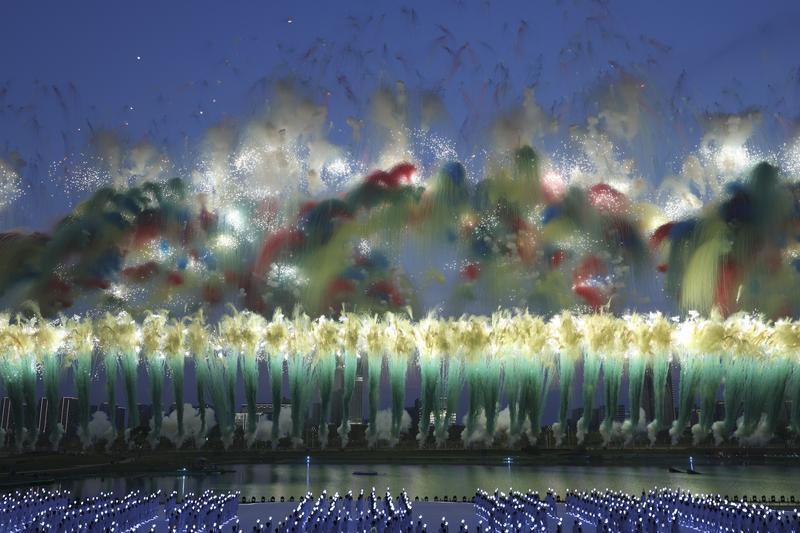 这是8月7日拍摄的开幕式上的焰火表演。