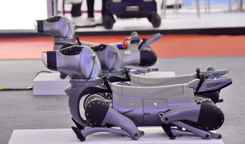 这是8月8日拍摄的2025世界机器人大会上展出的智能机器狗。