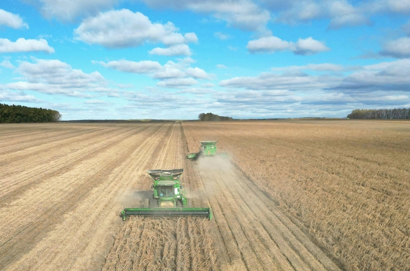 10月8日,在北大荒集团黑龙江建设农场有限公司第三管理区,农机在收获大豆(无人机照片)。