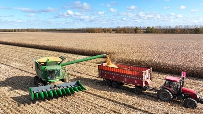 10月8日,在北大荒集团黑龙江格球山农场有限公司玉米地块,农机在卸粮(无人机照片)。