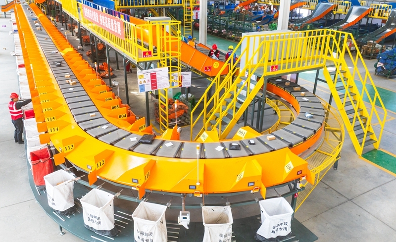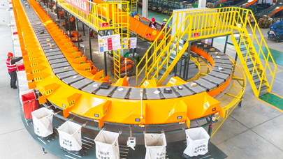 10月2日,工作人员在中国邮政集团有限公司甘肃省张掖市分公司邮件处理中心智能分拣流水作业线上工作。